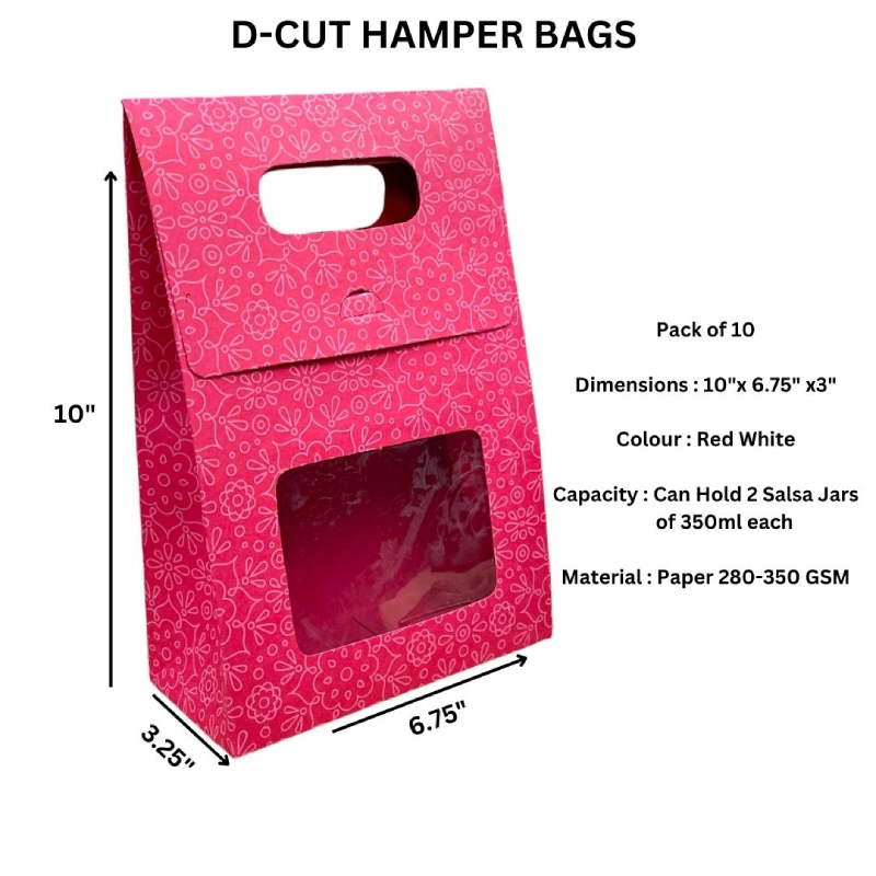 This D cut Jar hamper box is thoughtfully crafted to accommodate two jarsĀ TheĀ design is both elegant and practical, ensuring that the jars are securely presented. Ideal for any occasion, this hamper combines sophistication with a personal touch, offering a delightful experience whether for gifting or personal indulgence.