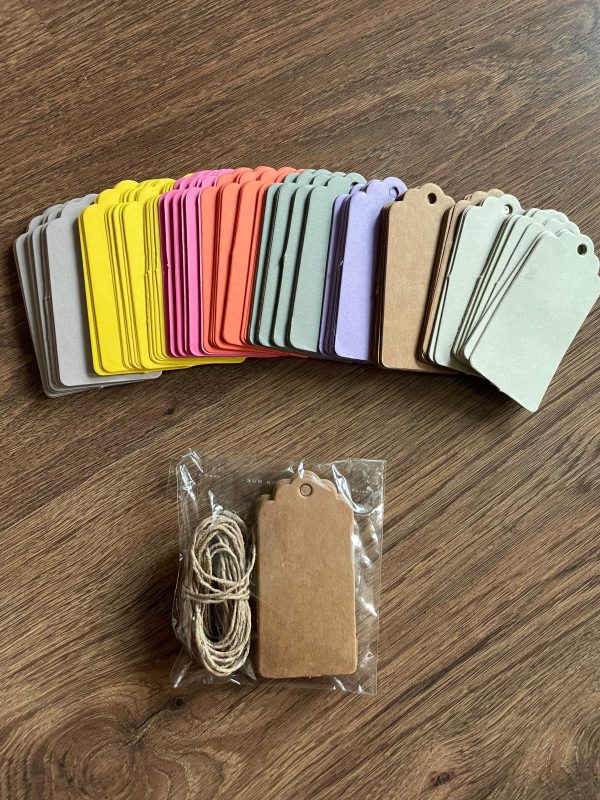 A gift tag is a small, decorative card attached to a gift, typically featuring a space for the sender’s name, the recipient’s name, and a brief message. It adds a personal touch and helps identify who the gift is from and for. Gift tags come in various shapes, sizes, and designs, often complementing the gift’s wrapping and the occasion. All tags come along with twine .